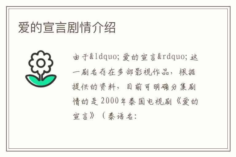 由于“爱的宣言”这一剧名存在多部影视作品,根据提供的资料,目前可明确分集剧情的是 2000年泰国电视剧《爱的宣言》(泰语名:รักประกาศิต),该剧共16集,讲述了傲娇农场主与能干女经理的爱情故事。以下是结合现有信息整理的详细分集剧情(注:部分集数内容未完全覆盖,将优先呈现明确剧情):