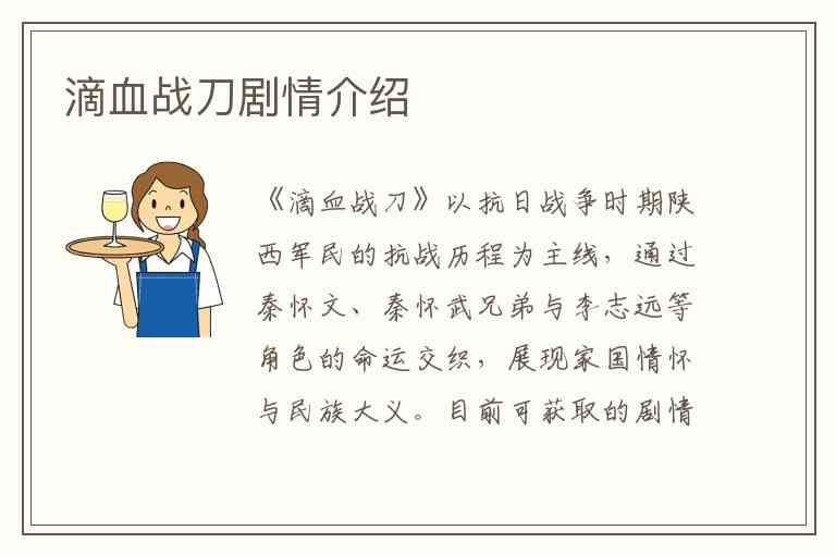 《滴血战刀》以抗日战争时期陕西军民的抗战历程为主线,通过秦怀文、秦怀武兄弟与李志远等角色的命运交织,展现家国情怀与民族大义。目前可获取的剧情信息集中在第31至33集,以下是具体情节: