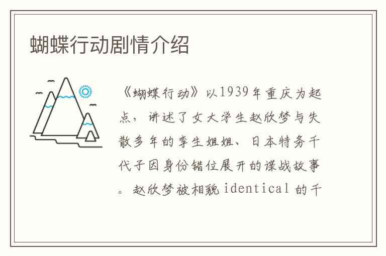 《蝴蝶行动》以1939年重庆为起点,讲述了女大学生赵欣梦与失散多年的孪生姐姐、日本特务千代子因身份错位展开的谍战故事。赵欣梦被相貌 identical 的千代子绑架后,发现对方竟是幼时分离的亲姐妹——千代子实为日本特务北条荣一的养女,而两人的父亲赵延年正是当年导致姐妹失散的关键人物。获救后的赵欣梦决定冒充千代子潜入北条机关,以"蝴蝶行动"为名执行卧底任务,在国共双重身份的李汉正协助下逐步瓦解日军阴谋,却同时陷入亲情、信仰与爱情的多重困境。