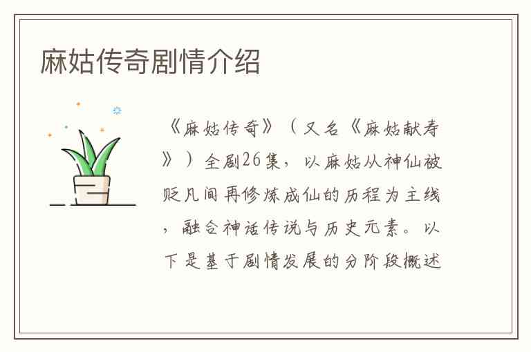 《麻姑传奇》(又名《麻姑献寿》)全剧26集,以麻姑从神仙被贬凡间再修炼成仙的历程为主线,融合神话传说与历史元素。以下是基于剧情发展的分阶段概述(注:公开资料未披露单集详细标题及分镜,此处按核心情节节点划分):