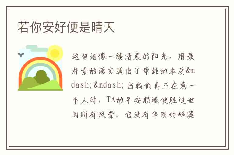 这句话像一缕清晨的阳光,用最朴素的语言道出了牵挂的本质——当我们真正在意一个人时,TA的平安顺遂便胜过世间所有风景。它没有华丽的辞藻,却将那份把对方放在心上的温柔,化作了对天气最纯粹的期待:你若安好,连雨天都会变成晴天。