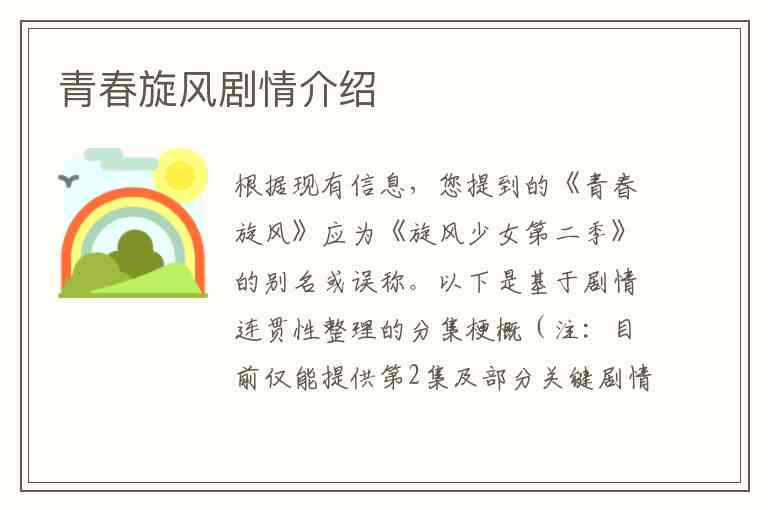 根据现有信息,您提到的《青春旋风》应为《旋风少女第二季》的别名或误称。以下是基于剧情连贯性整理的分集梗概(注:目前仅能提供第2集及部分关键剧情节点内容):