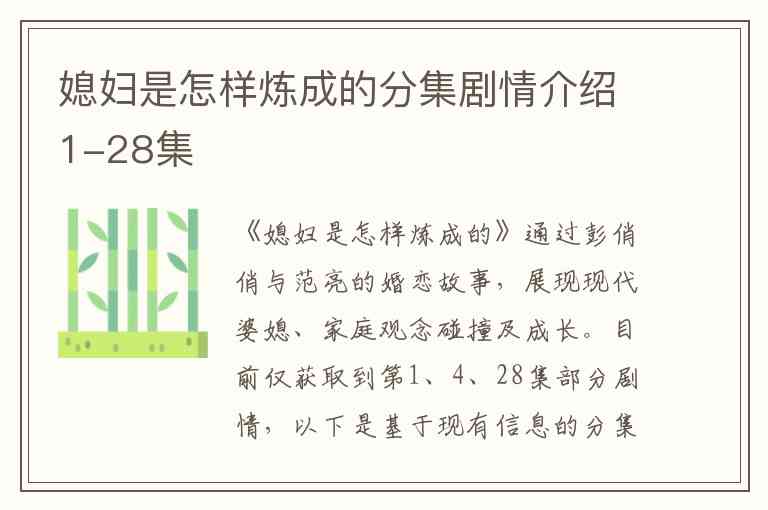 《媳妇是怎样炼成的》通过彭俏俏与范亮的婚恋故事,展现现代婆媳、家庭观念碰撞及成长。目前仅获取到第1、4、28集部分剧情,以下是基于现有信息的分集介绍: