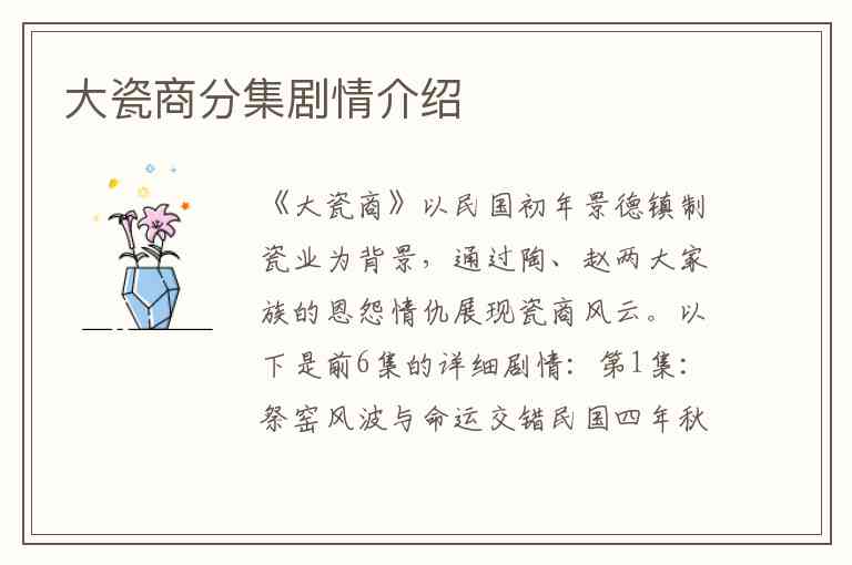 《大瓷商》以民国初年景德镇制瓷业为背景,通过陶、赵两大家族的恩怨情仇展现瓷商风云。以下是前6集的详细剧情: