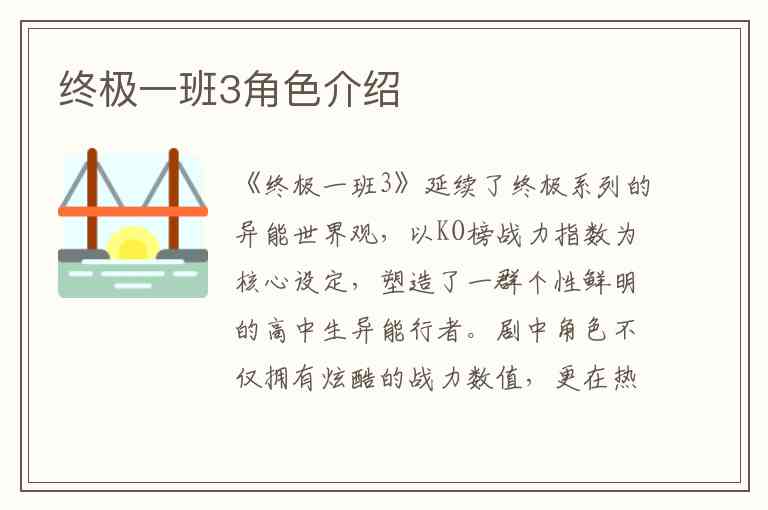 《终极一班3》延续了终极系列的异能世界观,以KO榜战力指数为核心设定,塑造了一群个性鲜明的高中生异能行者。剧中角色不仅拥有炫酷的战力数值,更在热血对抗与情感纠葛中展现出青春群像的多面性。以下从核心人物、KO榜强者及关键配角三个维度解析角色魅力: