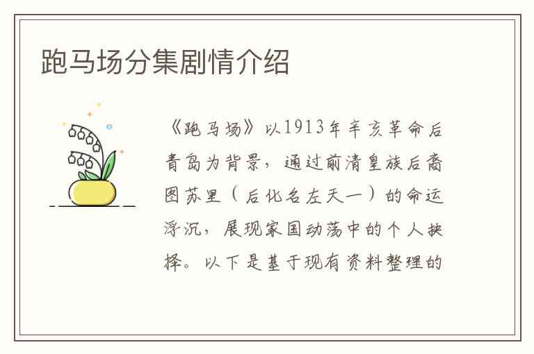 《跑马场》以1913年辛亥革命后青岛为背景,通过前清皇族后裔图苏里(后化名左天一)的命运浮沉,展现家国动荡中的个人抉择。以下是基于现有资料整理的分集剧情(注:部分集数信息缺失,欢迎补充):