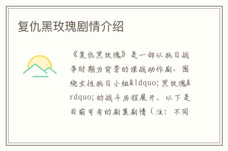 《复仇黑玫瑰》是一部以抗日战争时期为背景的谍战动作剧,围绕女性抗日小组“黑玫瑰”的战斗历程展开。以下是目前可考的剧集剧情(注:不同来源存在“黑玫瑰”“复仇黑玫瑰”“铁血女骑兵”等名称混用情况,此处以文档明确标注“复仇黑玫瑰”的内容为主):