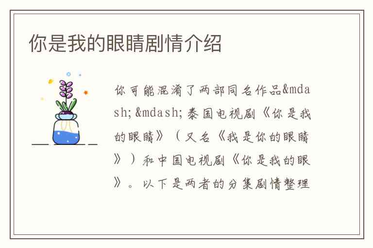 你可能混淆了两部同名作品——泰国电视剧《你是我的眼睛》(又名《我是你的眼睛》)和中国电视剧《你是我的眼》。以下是两者的分集剧情整理: