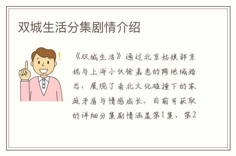《双城生活》通过北京姑娘郝京妮与上海小伙徐嘉惠的跨地域婚恋,展现了南北文化碰撞下的家庭矛盾与情感成长。目前可获取的详细分集剧情涵盖第1集、第2-3集相关情节及第24集,其余集数信息暂不完整: