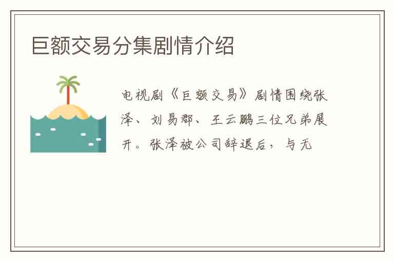 电视剧《巨额交易》剧情围绕张泽、刘易郡、王云鹏三位兄弟展开。张泽被公司辞退后,与无