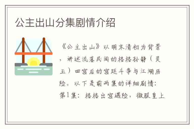 《公主出山》以明末清初为背景,讲述流落民间的格格孙静(灵玉)回宫后的宫廷斗争与江湖历险。以下是前两集的详细剧情: