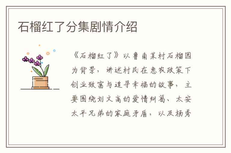 《石榴红了》以鲁南某村石榴园为背景,讲述村民在惠农政策下创业致富与追寻幸福的故事,主要围绕刘文高的爱情纠葛、太安太平兄弟的家庭矛盾,以及杨秀云的创业之路展开,全剧共36集。以下是部分关键集数的详细剧情: