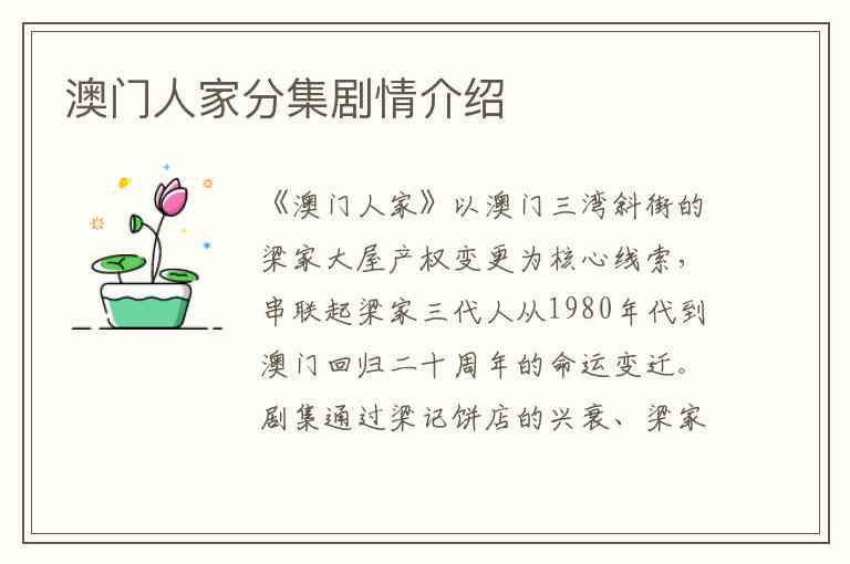 《澳门人家》以澳门三湾斜街的梁家大屋产权变更为核心线索,串联起梁家三代人从1980年代到澳门回归二十周年的命运变迁。剧集通过梁记饼店的兴衰、梁家与苏家的恩怨情仇,展现了澳门普通市民在时代浪潮中的坚守与成长,以及"有信、有心、有信心"的家风传承。