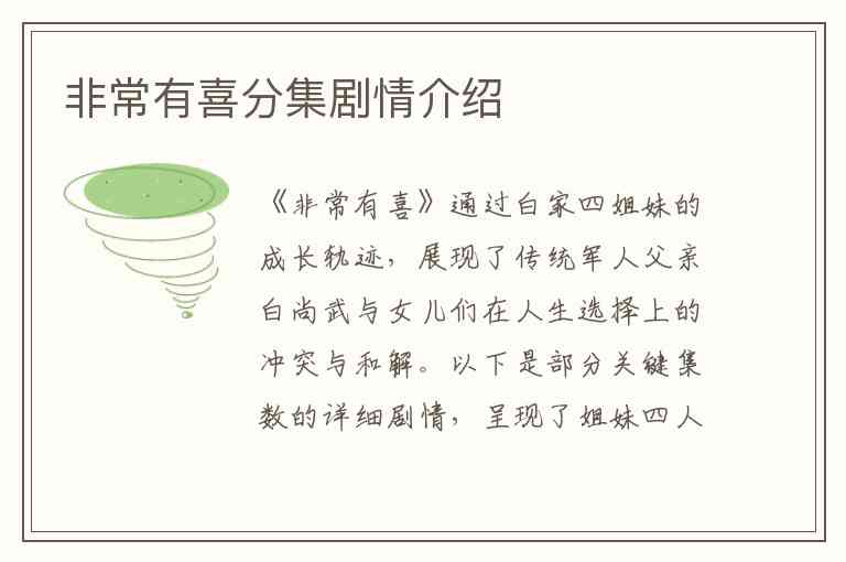 《非常有喜》通过白家四姐妹的成长轨迹,展现了传统军人父亲白尚武与女儿们在人生选择上的冲突与和解。以下是部分关键集数的详细剧情,呈现了姐妹四人在婚姻、事业、亲情中的挣扎与蜕变: