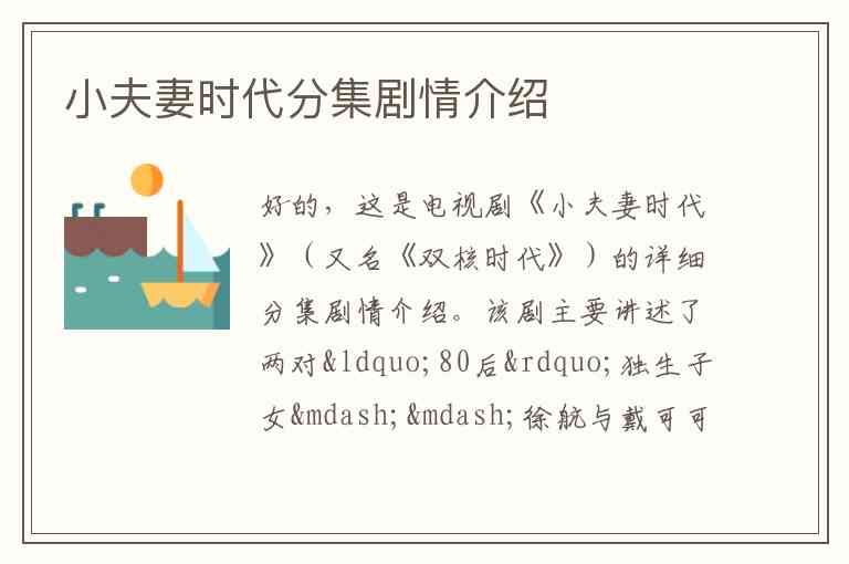 好的,这是电视剧《小夫妻时代》(又名《双核时代》)的详细分集剧情介绍。该剧主要讲述了两对“80后”独生子女——徐航与戴可可、叶莹与李楠,在恋爱、结婚、生子过程中所面临的各种挑战和成长。