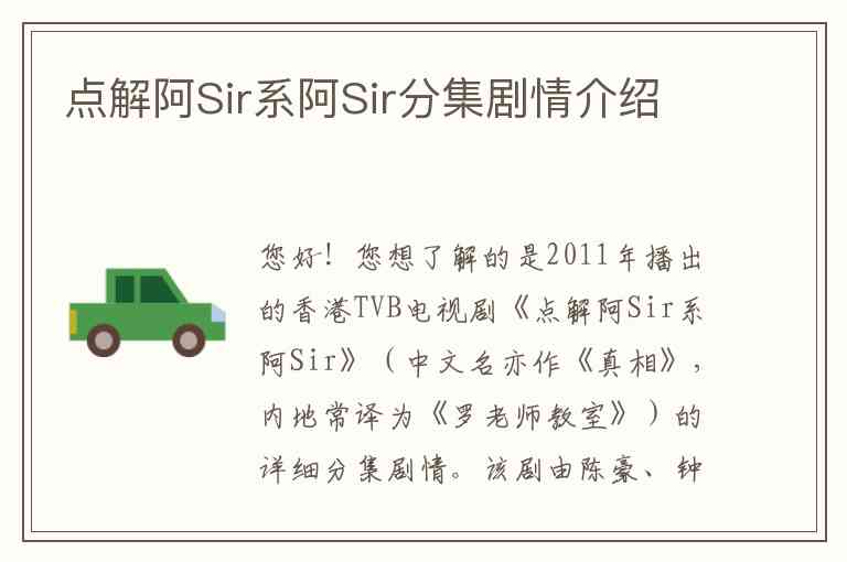 您好!您想了解的是2011年播出的香港TVB电视剧《点解阿Sir系阿Sir》(中文名亦作《真相》,内地常译为《罗老师教室》)的详细分集剧情。该剧由陈豪、钟嘉欣、吴卓羲、杨怡等主演,讲述了警察罗耀华(陈豪 饰)卧底成为中学老师,调查校园黑帮问题,并与学生和同事之间发生的一系列故事。