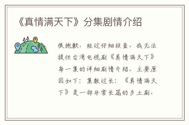 很抱歉,经过仔细核查,我无法提供台湾电视剧《真情满天下》每一集的详细剧情介绍。