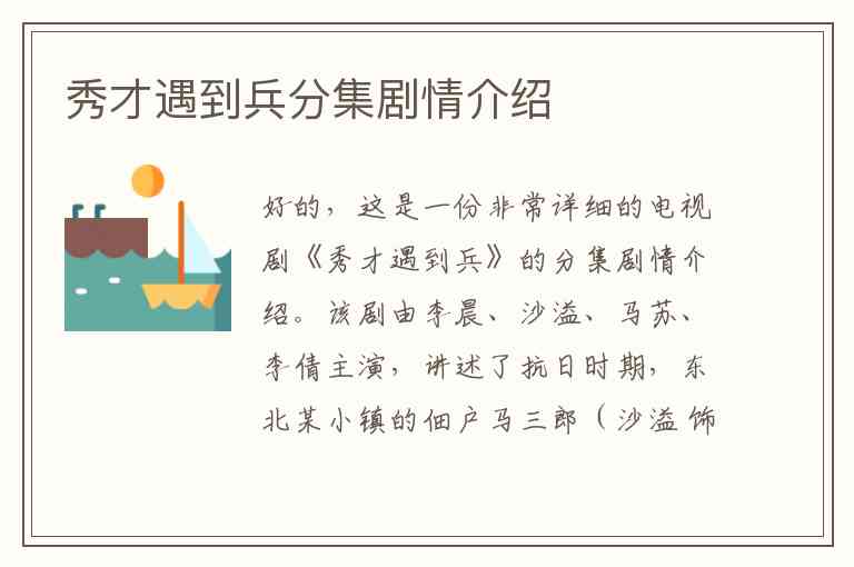 好的,这是一份非常详细的电视剧《秀才遇到兵》的分集剧情介绍。该剧由李晨、沙溢、马苏、李倩主演,讲述了抗日时期,东北某小镇的佃户马三郎(沙溢 饰)、富家书生龙千言(李晨 饰)、戏班花旦万山红(马苏 饰)和青龙会大当家高亚男(李倩 饰)四人,在国难当头之际,从普通人成长为抗日英雄的传奇故事。