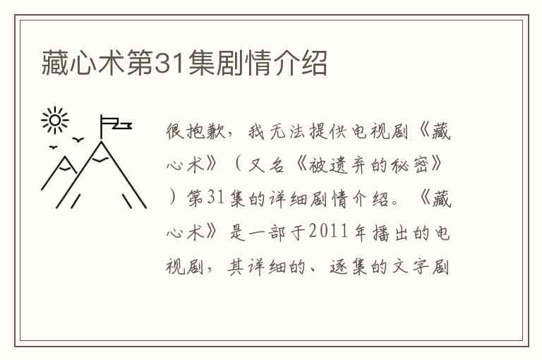 很抱歉,我无法提供电视剧《藏心术》(又名《被遗弃的秘密》)第31集的详细剧情介绍。