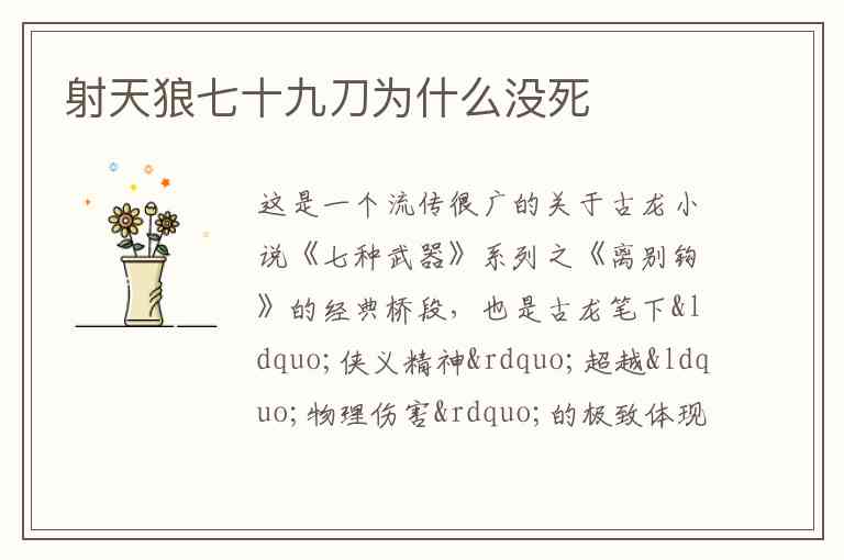 射天狼卫天鹏身中七十九刀没死,是因为主角杨铮运用神乎其技的刀法,刻意避开了所有要害。其目的不是为了饶他一命,而是为了从肉体到精神上彻底摧毁他,让他作为一个失败的活标本存在于江湖,这比杀了他更能彰显正义的力量和侠者的意志。 这是古龙式英雄主义和戏剧张力的一个巅峰表现。
