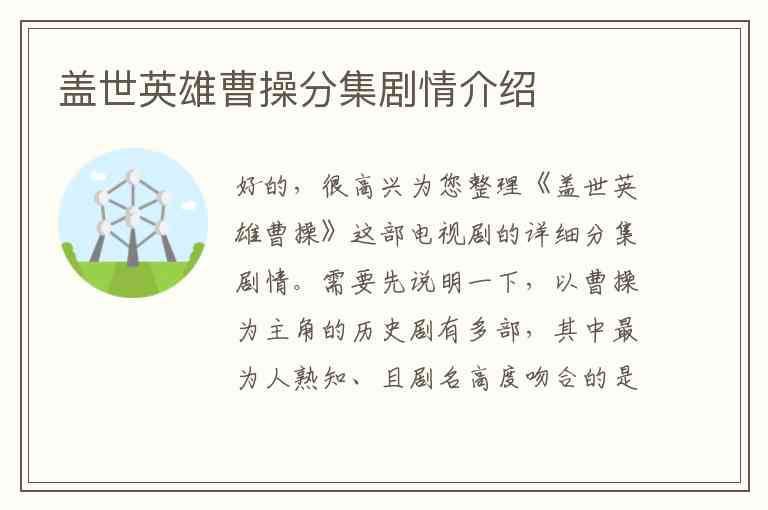 好的,很高兴为您整理《盖世英雄曹操》这部电视剧的详细分集剧情。需要先说明一下,以曹操为主角的历史剧有多部,其中最为人熟知、且剧名高度吻合的是2013年由赵立新、龚洁、孙洪涛、古巨基等人主演的《盖世英雄曹操》(也称《英雄曹操》或《曹操》)。