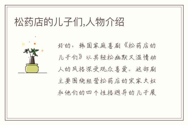好的,韩国家庭喜剧《松药店的儿子们》以其轻松幽默又温情动人的风格深受观众喜爱。这部剧主要围绕经营松药店的宋家夫妇和他们的四个性格迥异的儿子展开。