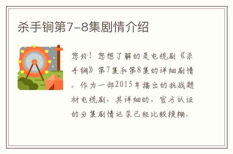 您好!您想了解的是电视剧《杀手锏》第7集和第8集的详细剧情。作为一部2015年播出的抗战题材电视剧,其详细的、官方认证的分集剧情记录已经比较模糊。