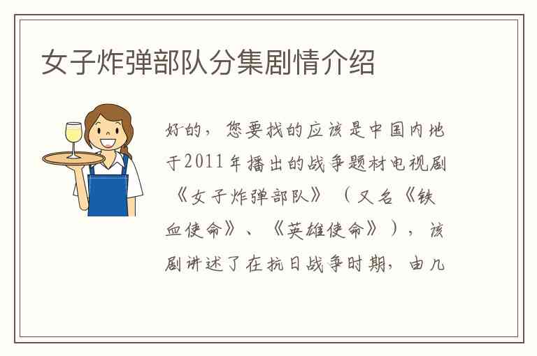 好的,您要找的应该是中国内地于2011年播出的战争题材电视剧 《女子炸弹部队》 (又名《铁血使命》、《英雄使命》),该剧讲述了在抗日战争时期,由几名身怀绝技的女队员组成的“炸弹小队”执行各种特殊任务的故事。