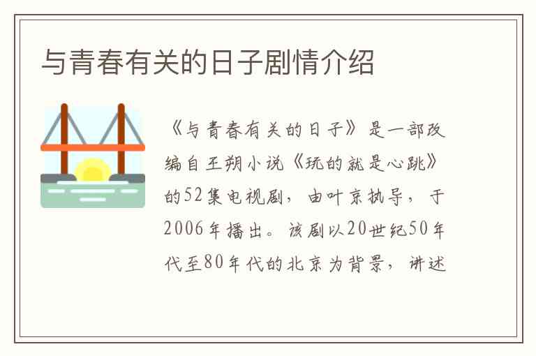 《与青春有关的日子》是一部改编自王朔小说《玩的就是心跳》的52集电视剧,由叶京执导,于2006年播出。该剧以20世纪50年代至80年代的北京为背景,讲述了一群军队大院青年的成长故事,展现了他们在特殊历史时期下的友情、爱情与人生抉择。以下是每集剧情的详细梳理: