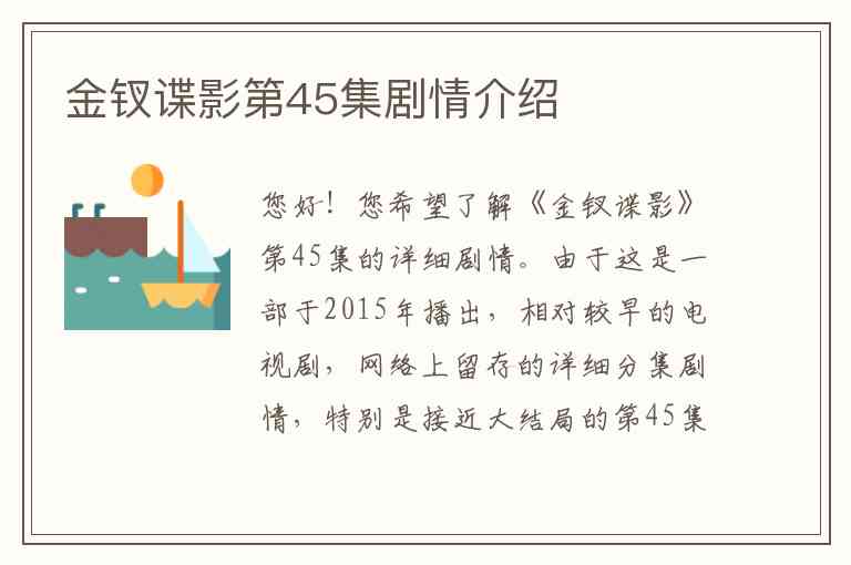 您好!您希望了解《金钗谍影》第45集的详细剧情。由于这是一部于2015年播出,相对较早的电视剧,网络上留存的详细分集剧情,特别是接近大结局的第45集,资料非常有限。