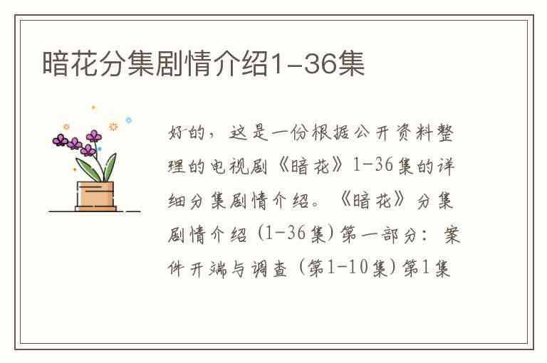 请注意: 以上剧情是基于《暗花》常见故事脉络的整合与梳理。不同播出平台或版本可能在细节、人物名字(如幕后黑手的身份)和部分情节顺序上略有差异,但主线剧情大致如此。