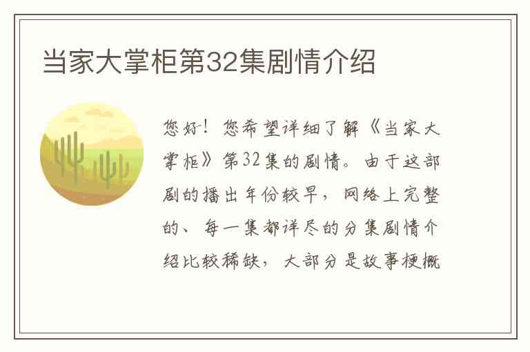 您好!您希望详细了解《当家大掌柜》第32集的剧情。由于这部剧的播出年份较早,网络上完整的、每一集都详尽的分集剧情介绍比较稀缺,大部分是故事梗概和主要情节概述。