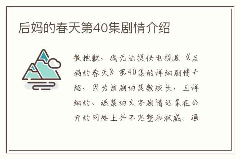 不过,我可以为您提供《后妈的春天》整体的故事梗概以及大致的剧情走向,这能帮助您了解第40集所处的大概阶段和整个故事的核心冲突。