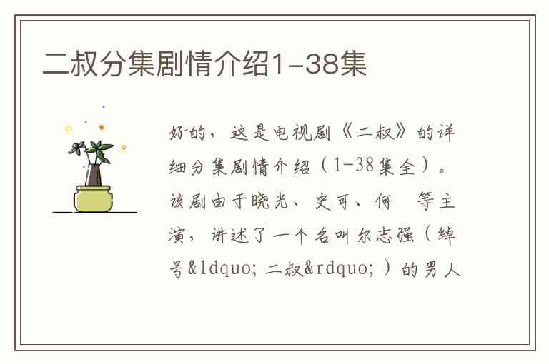 好的,这是电视剧《二叔》的详细分集剧情介绍(1-38集全)。该剧由于晓光、史可、何翯等主演,讲述了一个名叫尔志强(绰号“二叔”)的男人,从叛逆青年成长为有担当的家庭支柱的坎坷人生。