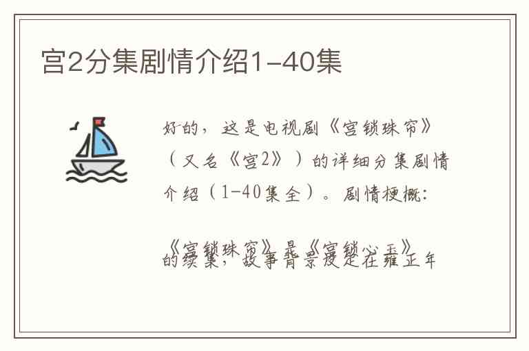 好的,这是电视剧《宫锁珠帘》(又名《宫2》)的详细分集剧情介绍(1-40集全)。