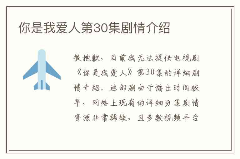 很抱歉,目前我无法提供电视剧《你是我爱人》第30集的详细剧情介绍。这部剧由于播出时间较早,网络上现有的详细分集剧情资源非常稀缺,且多数视频平台也未提供足够细致的文字剧情梗概。