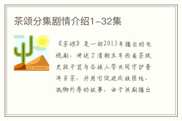 《茶颂》是一部2013年播出的电视剧,讲述了清朝末年西南茶政史段子苴与各族人等共同守护普洱贡茶,并用它促进民族团结、抵御外辱的故事。