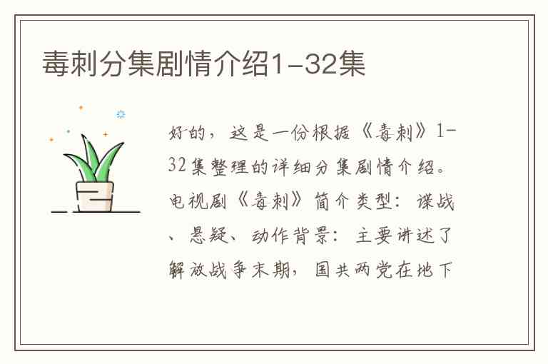 好的,这是一份根据《毒刺》1-32集整理的详细分集剧情介绍。
