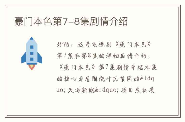 好的,这是电视剧《豪门本色》第7集和第8集的详细剧情介绍。