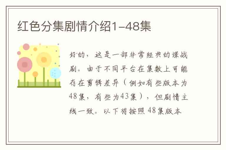 好的,这是一部非常经典的谍战剧。由于不同平台在集数上可能存在剪辑差异(例如有些版本为48集,有些为43集),但剧情主线一致。以下将按照 48集版本 为您提供每一集的详细分集剧情介绍。