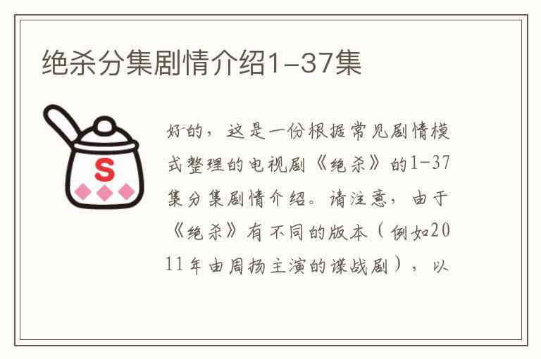 好的,这是一份根据常见剧情模式整理的电视剧《绝杀》的1-37集分集剧情介绍。请注意,由于《绝杀》有不同的版本(例如2011年由周扬主演的谍战剧),以下内容是基于该谍战剧版本的典型剧情结构进行梳理的。
