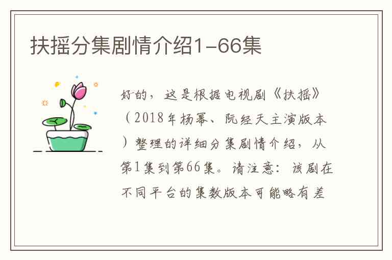 好的,这是根据电视剧《扶摇》(2018年杨幂、阮经天主演版本)整理的详细分集剧情介绍,从第1集到第66集。