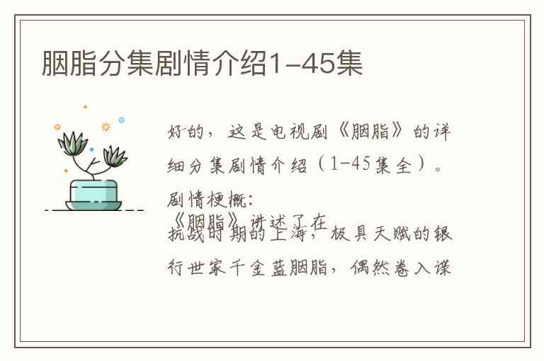 好的,这是电视剧《胭脂》的详细分集剧情介绍(1-45集全)。