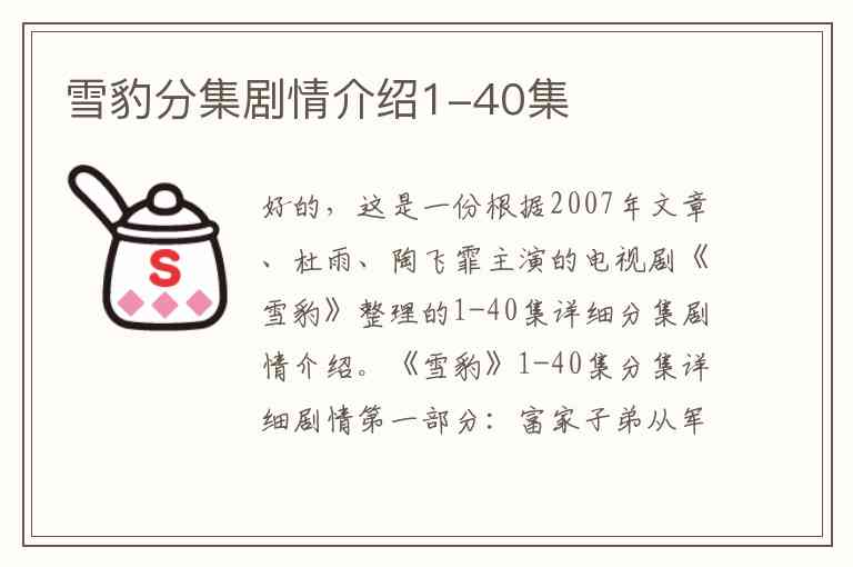 好的,这是一份根据2007年文章、杜雨、陶飞霏主演的电视剧《雪豹》整理的1-40集详细分集剧情介绍。