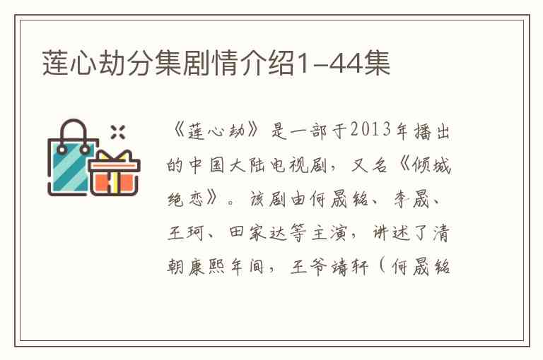 《莲心劫》是一部于2013年播出的中国大陆电视剧,又名《倾城绝恋》。该剧由何晟铭、李晟、王珂、田家达等主演,讲述了清朝康熙年间,王爷靖轩(何晟铭 饰)与美璃格格(李晟 饰)之间一段跌宕起伏、虐恋情深的爱情故事。