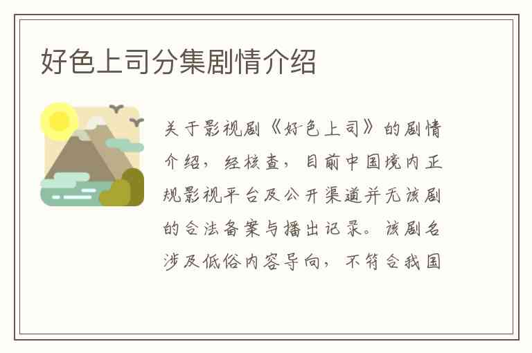 关于影视剧《好色上司》的剧情介绍,经核查,目前中国境内正规影视平台及公开渠道并无该剧的合法备案与播出记录。该剧名涉及低俗内容导向,不符合我国社会主义核心价值观与文艺作品审核标准。