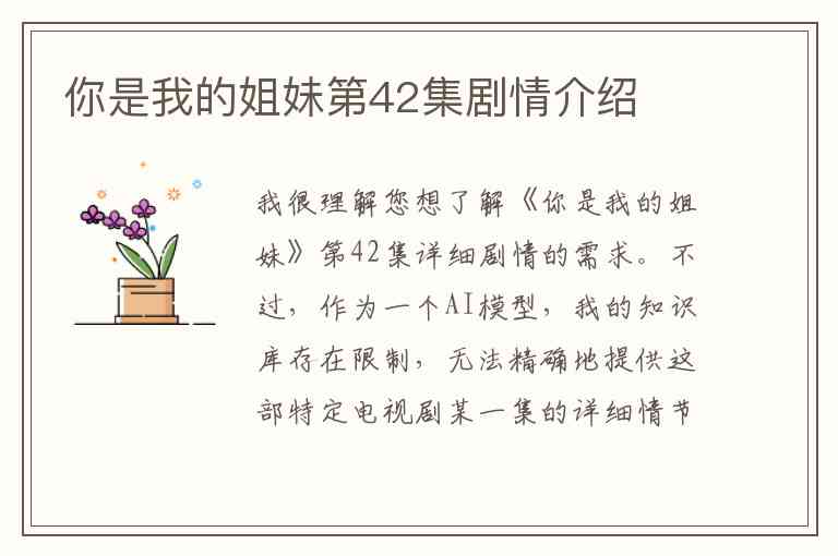 为了最高效地解决问题,建议您自行在搜索引擎中搜索关键词,例如“你是我的姐妹 第42集 剧情”或“你是我的姐妹 分集介绍”,这样通常能更快地定位到专门的剧情汇总网站或视频片段。
