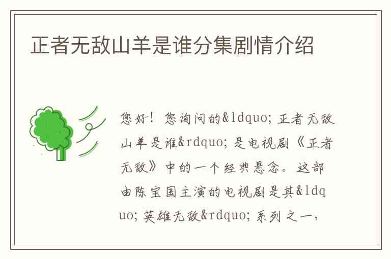 您好!您询问的“正者无敌山羊是谁”是电视剧《正者无敌》中的一个经典悬念。这部由陈宝国主演的电视剧是其“英雄无敌”系列之一,剧情围绕川军将领冯天魁展开,而“山羊”是贯穿全剧的重要线索。