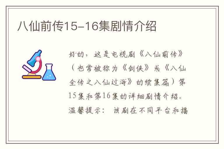 好的,这是电视剧《八仙前传》(也常被称为《剑侠》或《八仙全传之八仙过海》的续集篇)第15集和第16集的详细剧情介绍。