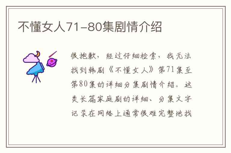 很抱歉,经过仔细检索,我无法找到韩剧《不懂女人》第71集至第80集的详细分集剧情介绍。